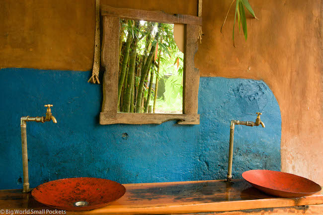 Toilets are dry and composting, used as fertiliser for the gardens, and natural materials such as bamboo, thatch, wood and local fabrics predominant.